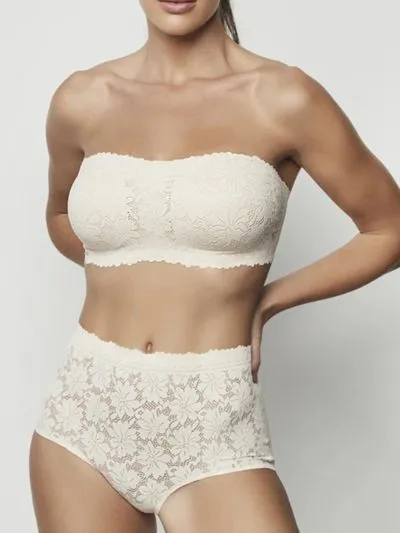 Pełne figi, które zapewniają duży komfort noszenia. Posiadają wysoki stan przez co podnoszą poczucie bezpieczeństwa. Przód wykonany jest z nieprześwitującego materiału, natomiast boki z siatki, na której naszyty jest haft ze wzorem. Ciekawy tył posiada transparentny materiał, który ładnie uwydatnia pośladki. Z tyłu efektownie przeszyte szwy tworzą mały otwór dodając przy tym oryginalności bieliźnie. Figi te to wysoka wygoda, a zarazem subtelność w jednym.