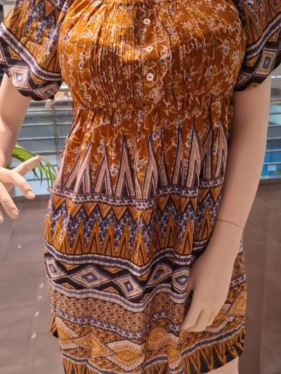 Zakochaj się w tej pięknej letniej sukience plażowej z krótkimi rękawami i odkrytymi ramionami. Uszyta z lekkiej, miękkiej tkaniny modalowej, w ciekawej kolorystyce z kwiatowym nadrukiem w górnej części przechodzącym w etniczne wzory. W Pasie gumka dla podkreślenia linii tali. Długość sukienki przed kolano. Kuszący i uwodzicielski model idealny na plaże jak również na wyjście na miasto.